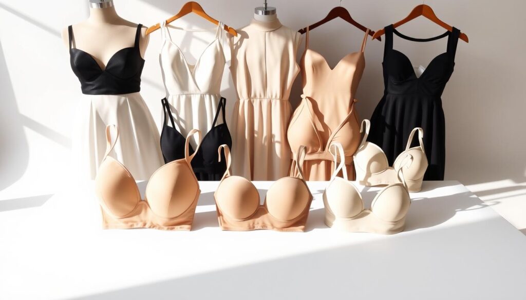 Did you know 70% of women struggle to find the right bra for high neck dresses? The perfect strapless or adhesive bra can change your whole look. It makes sure you’re both comfortable and confident.